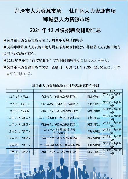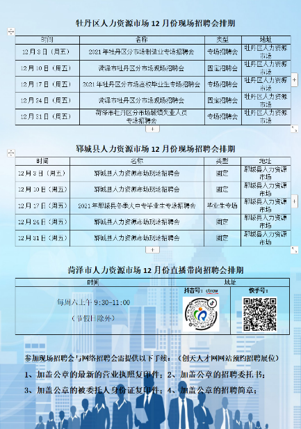 菏澤市人力資源市場(chǎng) 牡丹區(qū)人力資源市場(chǎng) 鄆城縣人力資源市場(chǎng) 2021年12月份招聘會(huì)排