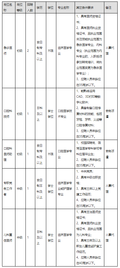 因醫(yī)院業(yè)務(wù)拓展,現(xiàn)面向社會(huì)公開招聘急診醫(yī)師2人,專職黨務(wù)工作者1人,兒科重癥醫(yī)師1人,以人事代理身份管理;招聘口腔科技師1人,口腔科醫(yī)師助理1人,以勞務(wù)派遣身份管理。具體事項(xiàng)公告如下: